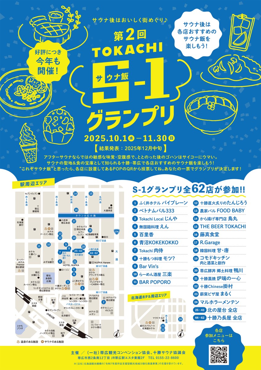 大好評だった第1回に続き、今年も10/1(水)~11/30(日)に「TOKACHI S-1グランプリ」を開催いたします!さらに追い汗をかくスパイシーな料理、爽やかにクールダウンできるドリンクなど、さまざまなメニューで全62店がエントリー中です。サウナでととのった後は、ぜひ参加店のおすすめサウナ飯をご堪能ください!!