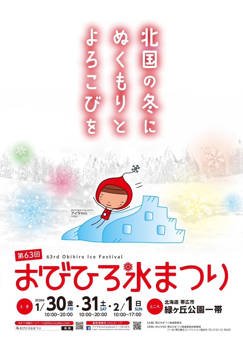 おびひろ氷まつりは、「北国の冬にぬくもりとよろこびを」をテーマに、帯広の厳しい冬の寒さを象徴する氷をメインとした作品やアトラクション、心温まるおもてなしで冬を楽しむわくわくしたおまつりとすることを目的に開催し、今年で63回目を迎えます。