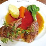 自家産の仔羊肉はクセがなく、フレッシュでジューシーな味わい。仔羊肉以外の食材にもこだわり、可能な限り自家産の有機野菜やハーブ、新得産の卵やチーズ、ニジマス、しいたけ、そば粉などを使用しています。