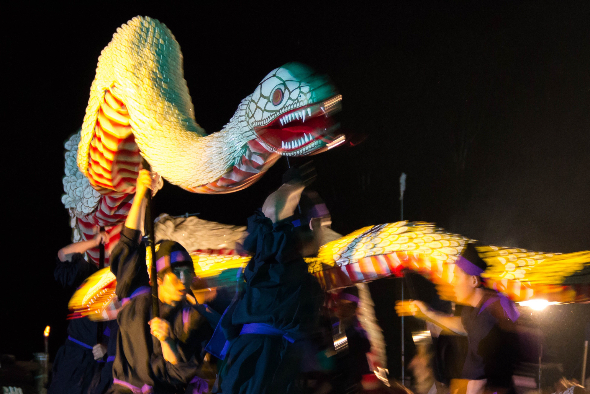 然別湖を舞台に2匹の白蛇と姫、そしてアイヌの人々の神秘の世界を作り上げる。